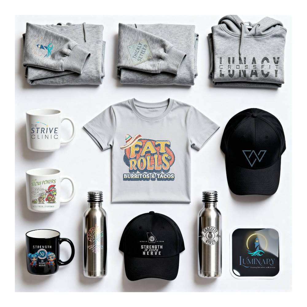 Your company’s swag, done right. Built around your logo, your vibe, and the inside jokes that only your people get.